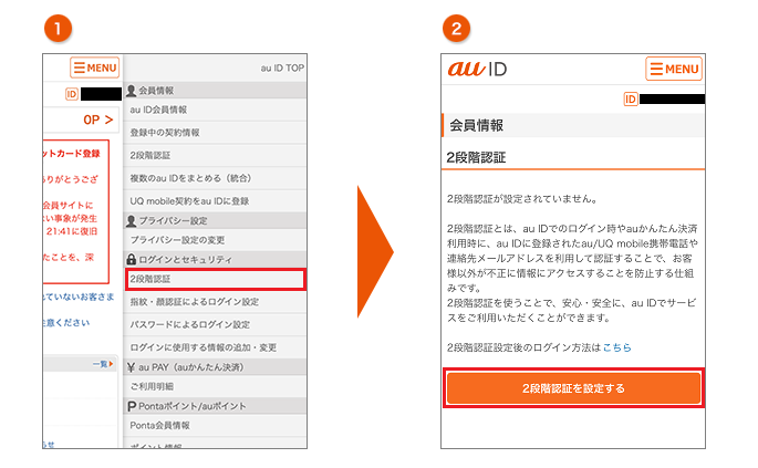 au ID会員情報サイトへアクセスし、au IDでログインします。 「MENU」アイコンをタップし「ログインとセキュリティ」内にある「2段階認証」をタップします。 |
