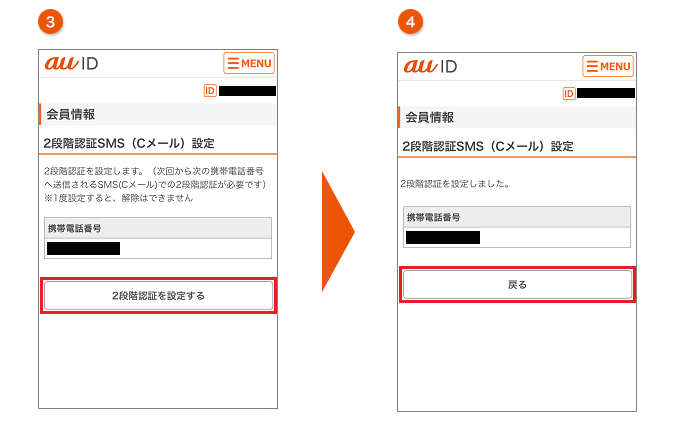 携帯電話番号を確認し、[2段階認証を設定する]をタップします。 | 「戻る」をタップします。 これで2段階認証の設定は完了です。 |