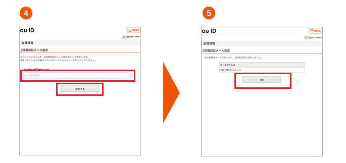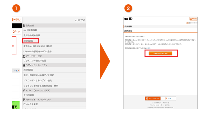au ID会員情報サイトへアクセスし、au IDでログインします。 「MENU」アイコンをタップし「会員情報」内にある「2段階認証」をタップします。 |