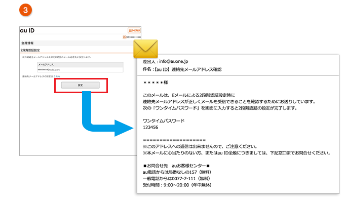 表示されるメールアドレスに2段階認証のメールを送信します。表示内容を確認の上で「設定」ボタンをタップします。 |
